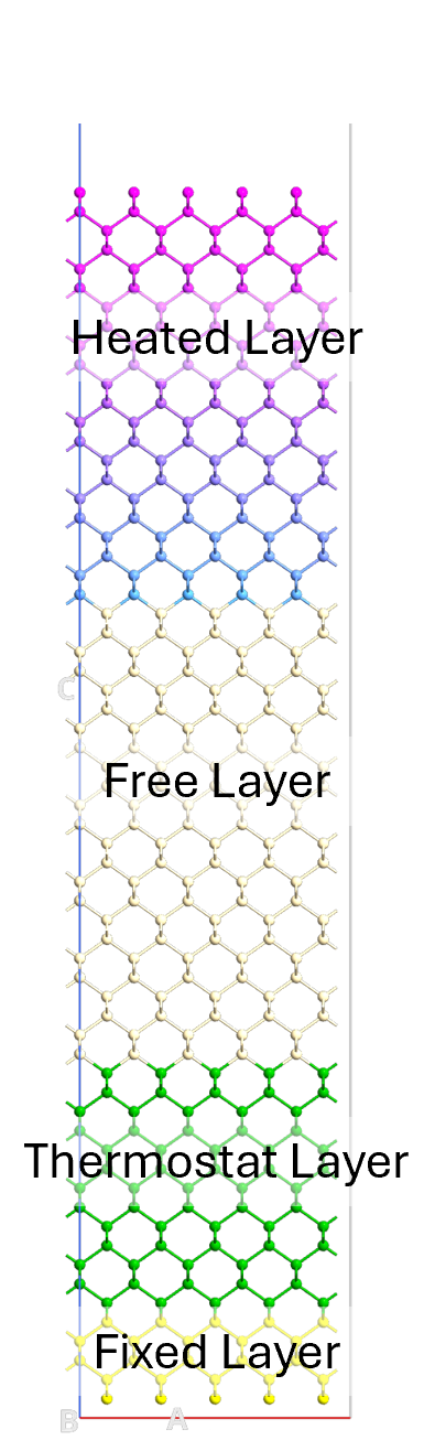 Free layer (remaining 600 atoms, ~31 Å thickness): Unconstrained atoms for thermal transport