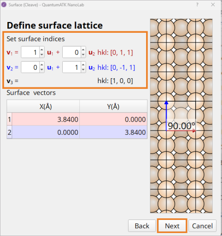 Builder Panel (1).In the Surface(Cleave) window, choose the [1,0,0] Miller indices (2) and click Next (3).