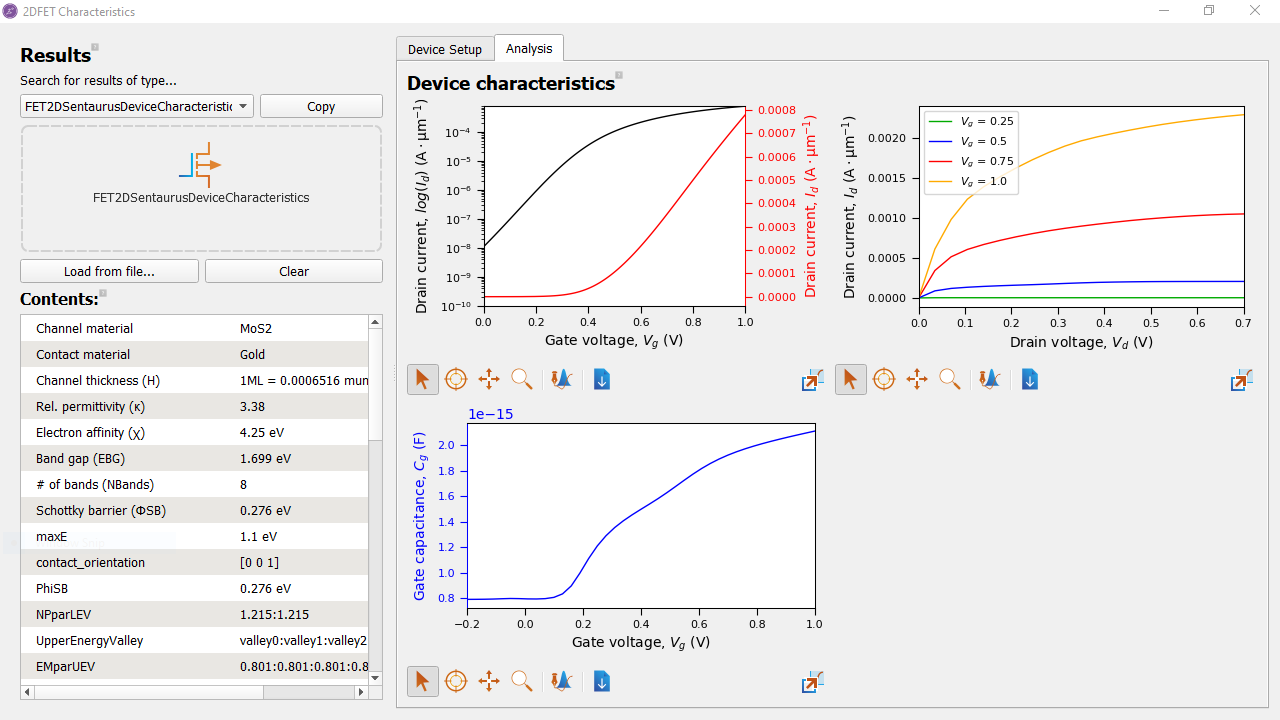 Fig. 219 Example of the Analysis tab in the 2DFET Characteristics plugin.¶