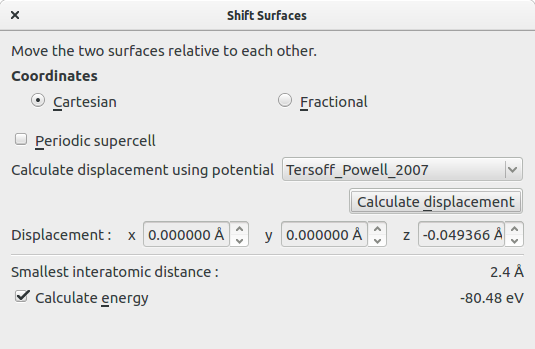 When a suitable lattice match has been found, the Shift Surfaces button can be used to shift one surface w.r.t. to the other. This can be done either manually or by minimizing the energy of the system. Using the second option, the geometry is optimized using a classical potential from the QuantumATK Classical package and with the constrains that each material acts as a rigid body. The optimization method is LBFGS and the optimization procedure ends when the inter-atomic forces are below 0.02 eV/Å. The calculated displacement vector is shown in the window together with the total energy of the system, if the Calculate energy checkbox is checked. The displacement is automatically applied to the interface. It should be noted, that his procedure only finds local minima of which there could be several. To find the global minima one should optimize the structure using several different starting points determined by the symmetry.