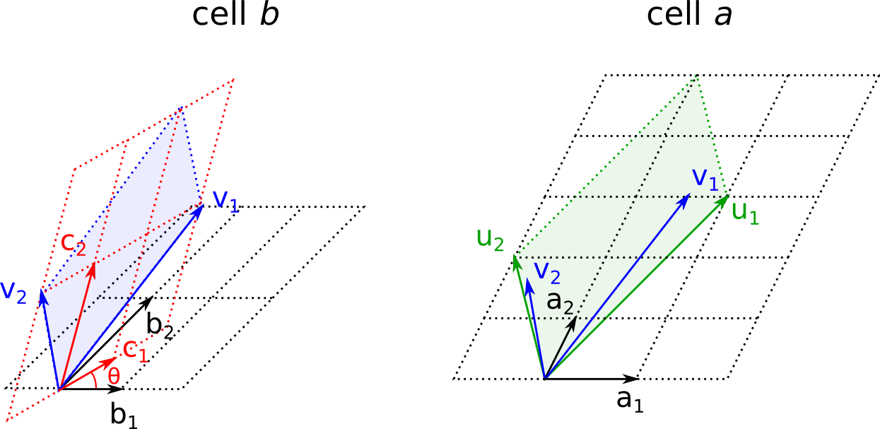 \[\begin{aligned} u &= U s'.\end{aligned}\]\(u\) (\(u_1\) or \(u_2\) in Fig. 163) corresponds to the lattice vector of cell a that \(v\) will be matched to.