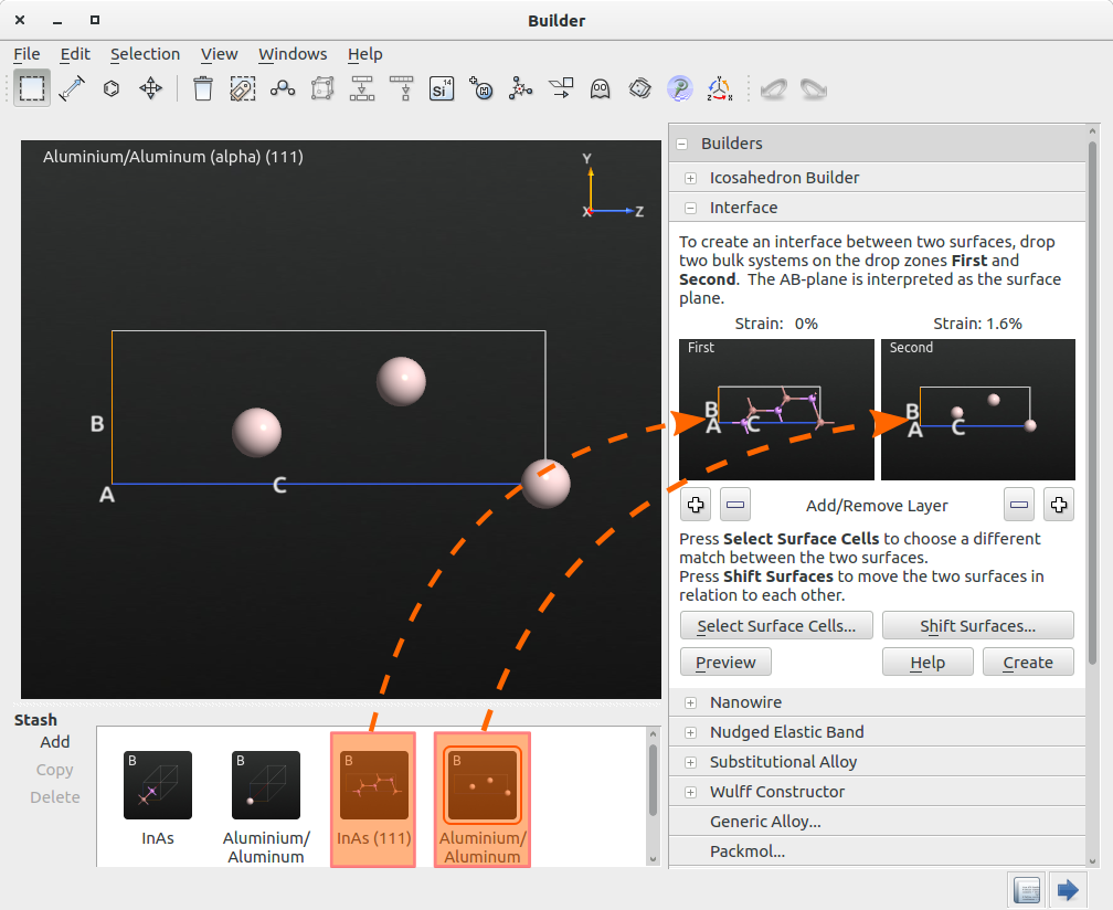 The Interface Builder of QuantumATK allows the construction of complex interfaces by automatically matching the 2D unit cells of two different surfaces and compare the strain. The input is two crystal surfaces which can be created from bulk systems using the Surface (Cleave) tool. A specified number of atomic layers can be added for each material, an atomic layer being defined as the atoms that lie with the same distance to the AB-plane of the unit cell.