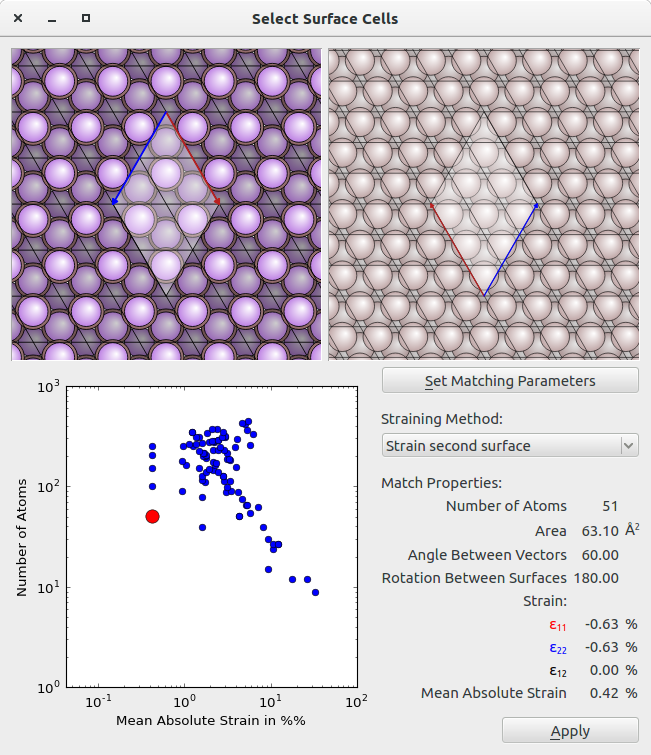 The Select Surface Cells button is used to view the results of the lattice matching. This opens a window where the strain of all the found matches is plotted against the total number of atoms in the interface unit cell, see Fig. 162. The selected unit cell is the red dot, one can select alternative matches by clicking the blue dots.