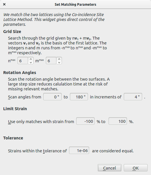 The matching parameters can be changed using the Set Matching Parameters button in the Select Surface Cells window, see Fig. 164. The default parameters are listed in the table below.