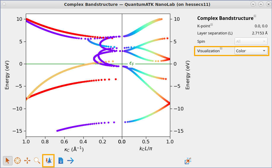 Fig. 45 2D visualization of complex band structure. Note how the color coding of the k-values applies both to the real and the complex parts of the band structure, which makes it easier to see where the complex bands are attached to the real ones.¶