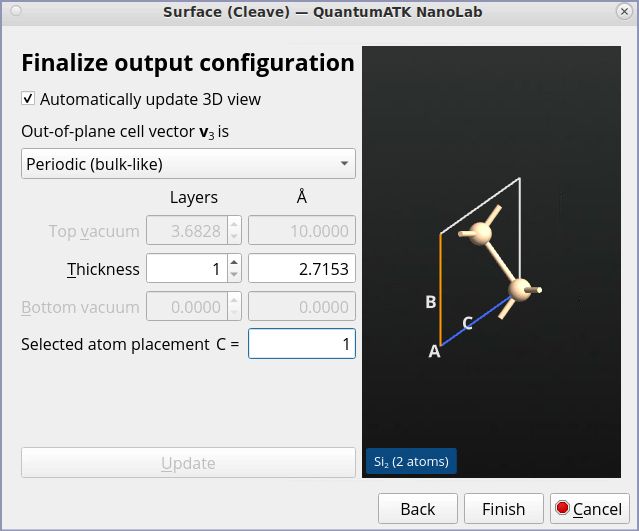 Search for “Surface (Cleave)” in the right-hand side Panel of the Builder. Open it and follow the next steps to set up the Si(100) surface:
