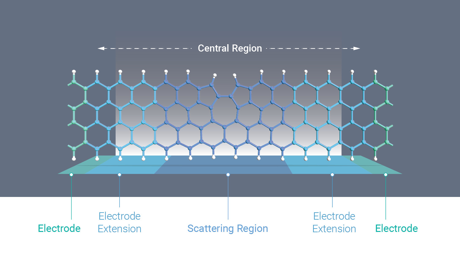 Current may flow between the two bulk Electrodes, but has to pass through the Scattering Region in the middle of the device. Both ends of the central region, called the Electrode Extensions, must be exact replicas of the corresponding electrode.