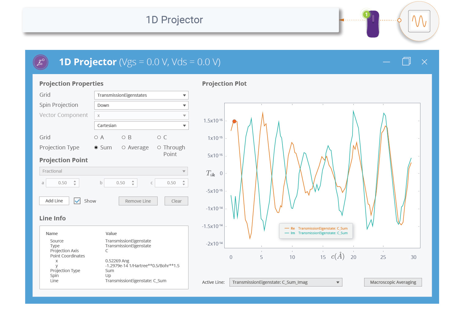 The 1D Projector is also available as an alternative visualization method. As illustrated below, by projecting the transmission eigenstates grid quantities onto a single real-space axis, the eigenstates may be visualized in a 2D plot.