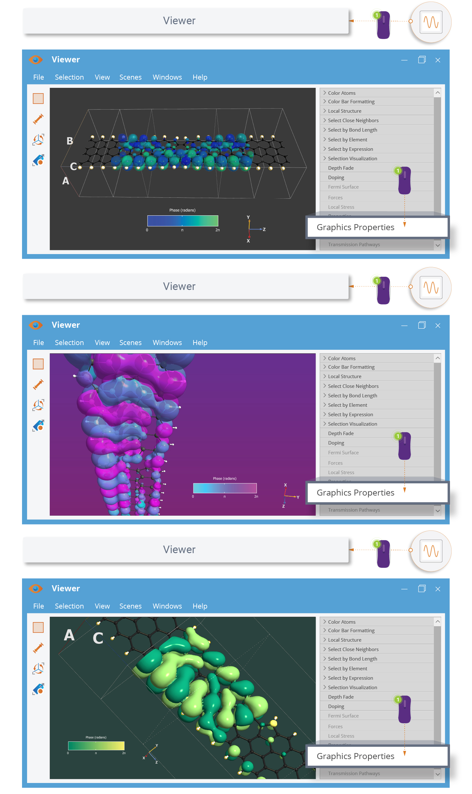 In this tutorial, the zero-bias transmission eigenstates for quantum numbers 0, 1, and 2 were already calculated as an additaional analysis on the IV Characteristics study object. These three eigenstates can therefore be visualized from the IV-Characteristics Analyzer.