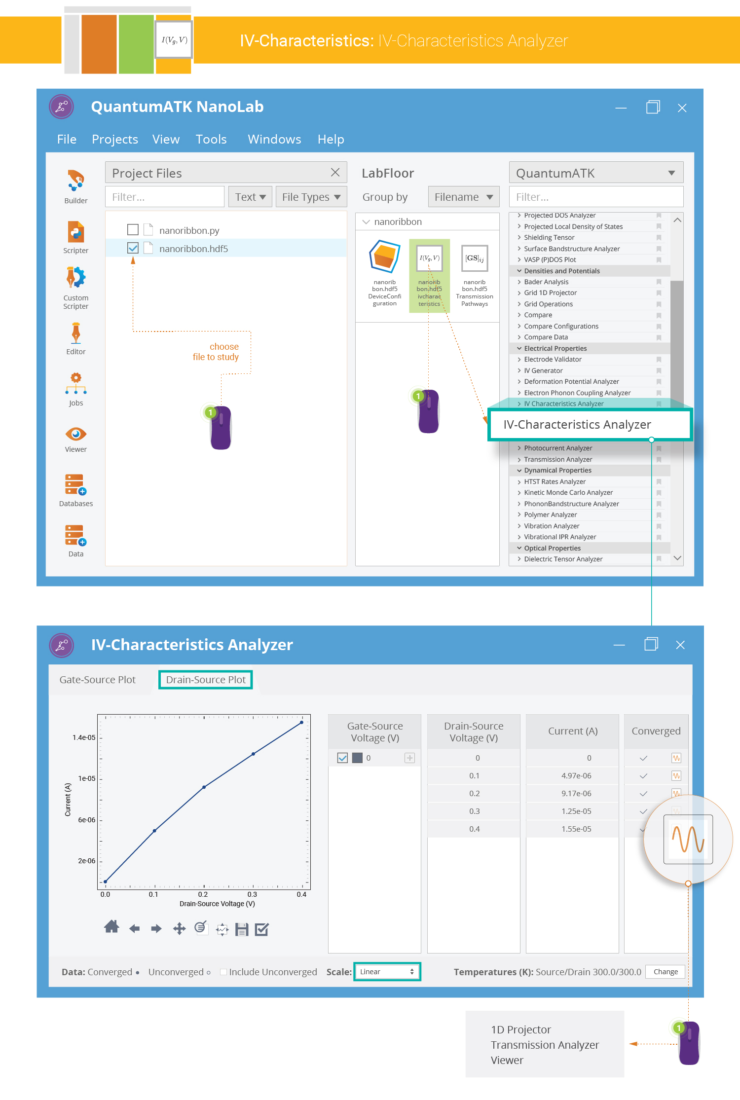 The IV Characteristics study object is a main QuantumATK electron transport analysis tool: It calculates I–V curves from finite-bias transmission spectra, and offers a range of additional analysis methods. The HDF5 file already contains the pre-calculated data, so select the IVCharacteristics object on the LabFloor and open the IV-Characteristics Analyzer tool to analyze it.