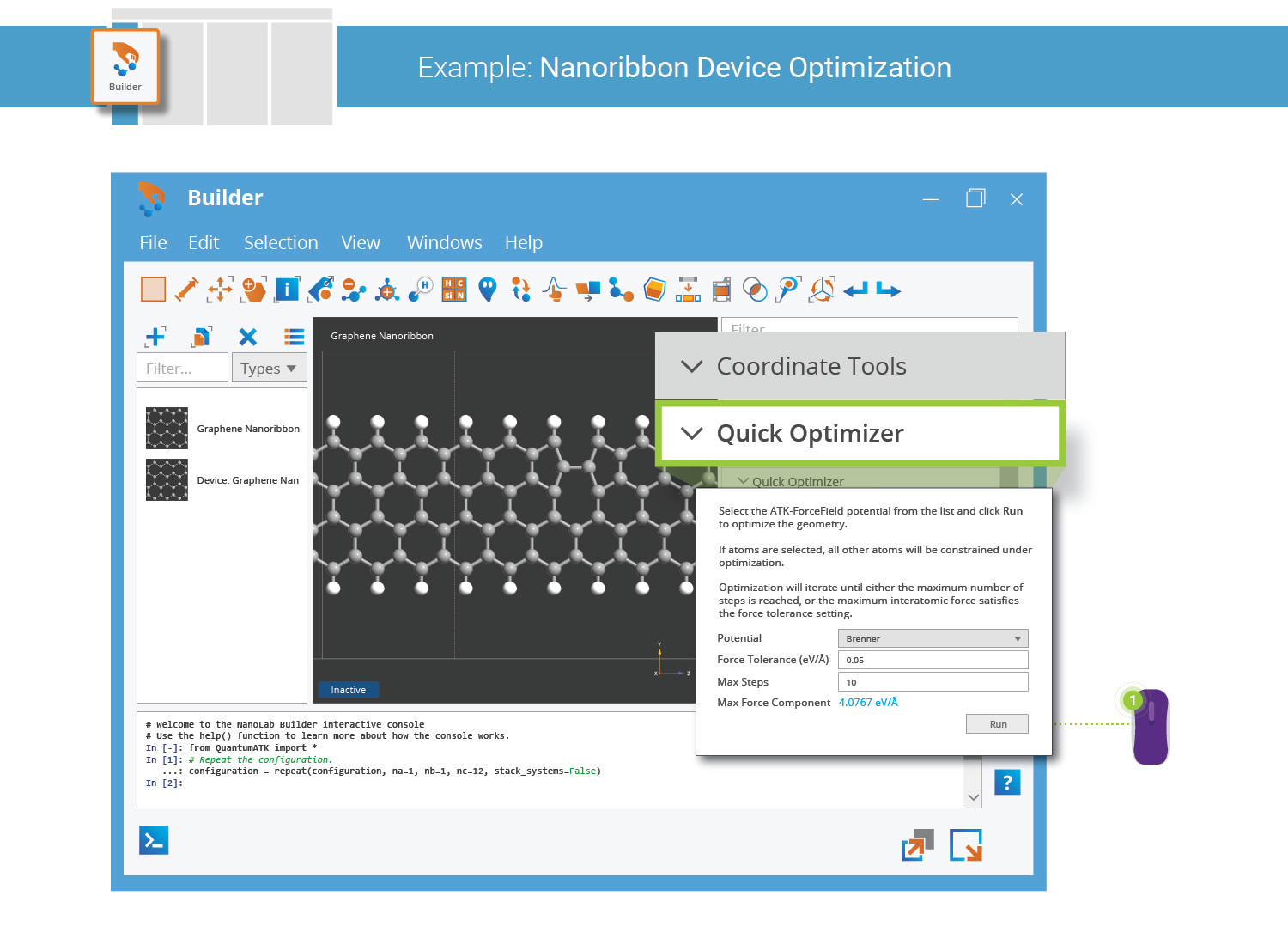 The Builder offers the very convenient Quick Optimizer plugin, which uses fast pair-potential calculations implemented in the ATK-ForceField calculator engine. Choose the Brenner potential and click Run to execute 10 geometry optimization steps.