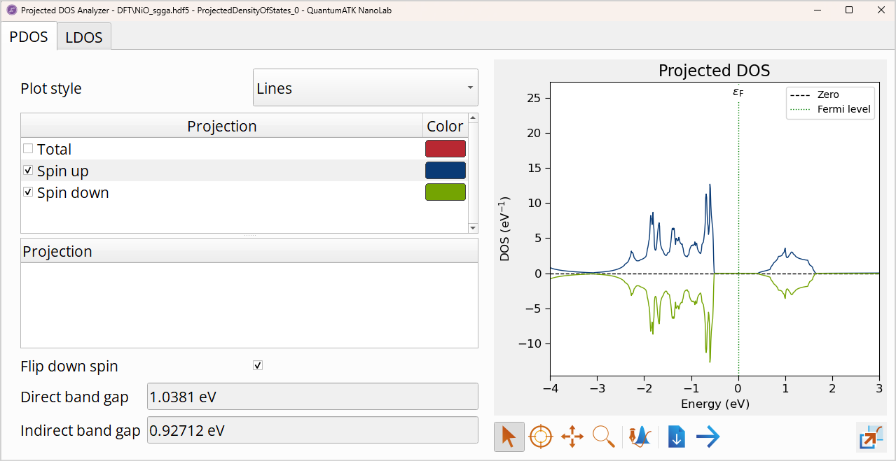 The plot shows the total projected density of states of the spin-up channel with a blue line and minus the result for the spin-down channel with a green line. If you select Flip down-spin in the Options menu, the density of states of the spin-down channel will be plotted on the negative axis.