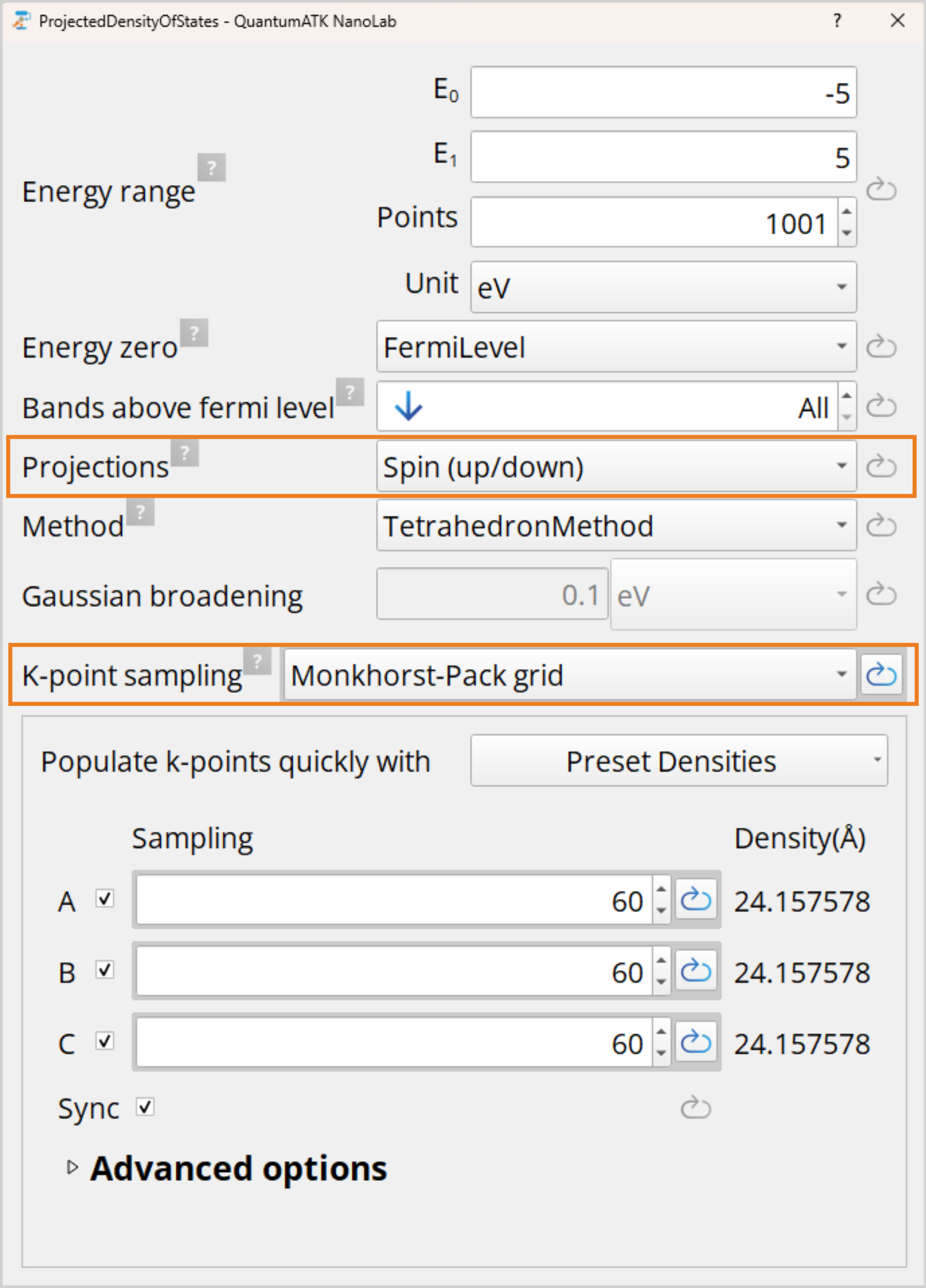 ProjectedDensityOfStates block and set Projections to Spin(up/down), this allows for the separation of the spin channels. A high k-point sampling is needed for sufficiently capturing fine details in the PDOS, thus change the K-point sampling from Default to Monkhorst-Pack grid and set 60x60x60 k-points.