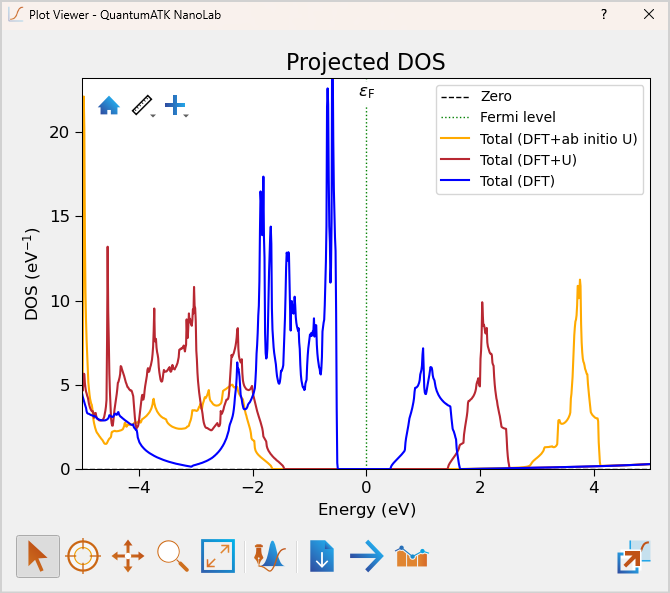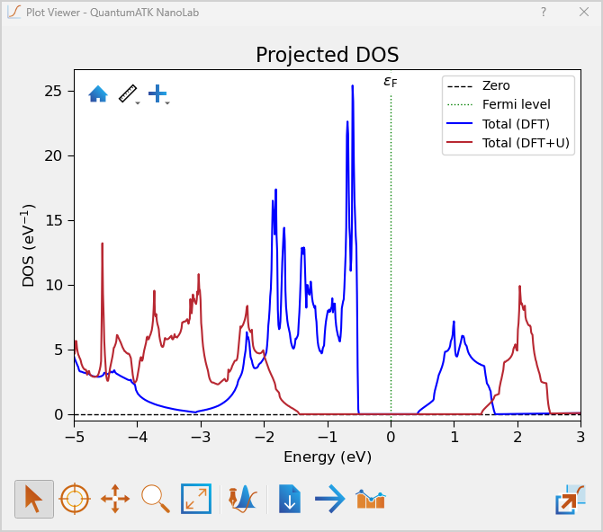 Data viewer you can open the Projected DOS Analyser as before for both the DFT and the DFT+U calculations and use the drag and drop functions to merge the plots as described in the Band Structure tutorial.